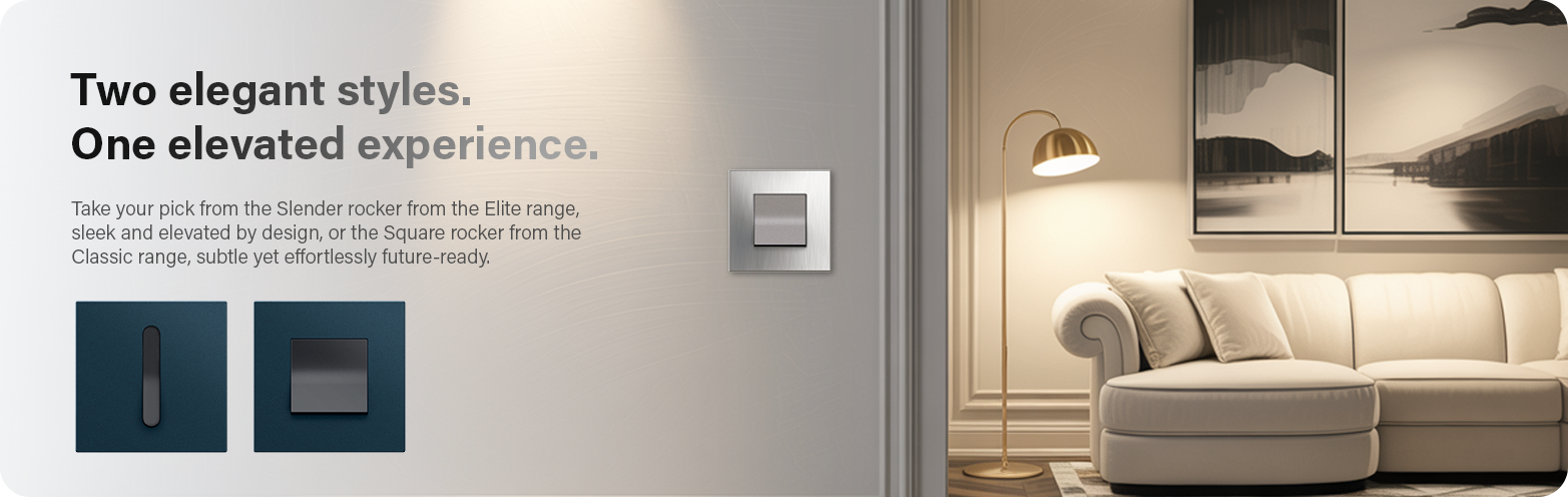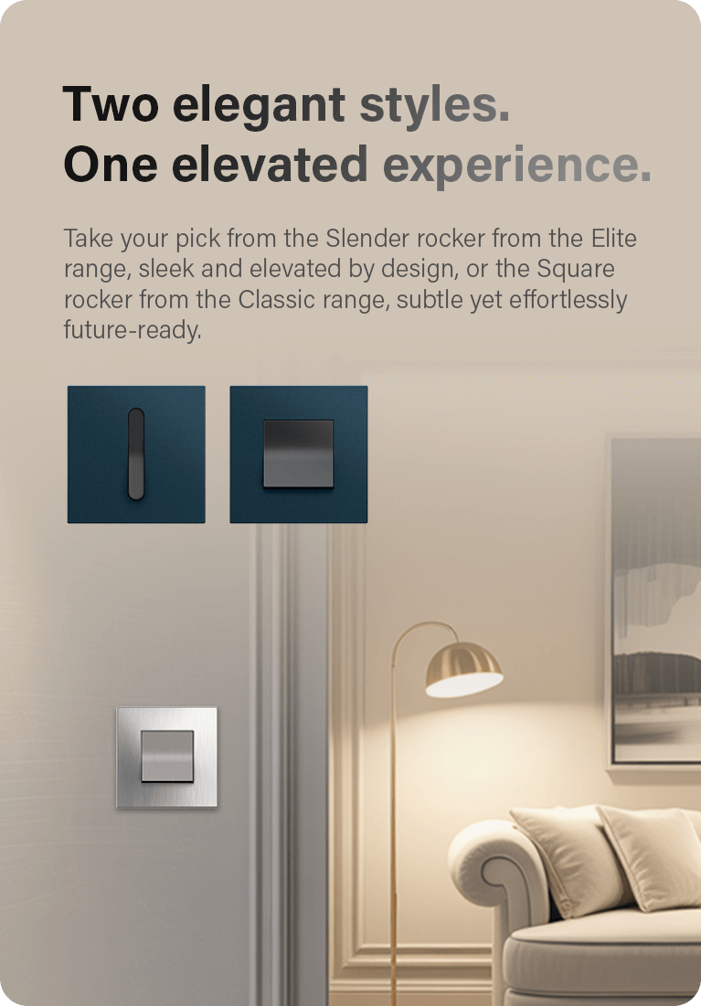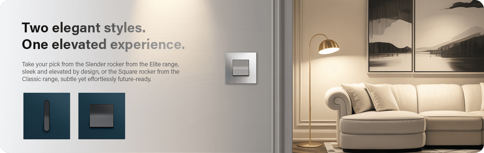 Both designs share the signature floating rocker element, creating a light and elegant impression as if it hovers above the plate. Hybrid plates also allow Classic and Elite modules to be combined within a single frame, delivering flexibility for premium projects worldwide.