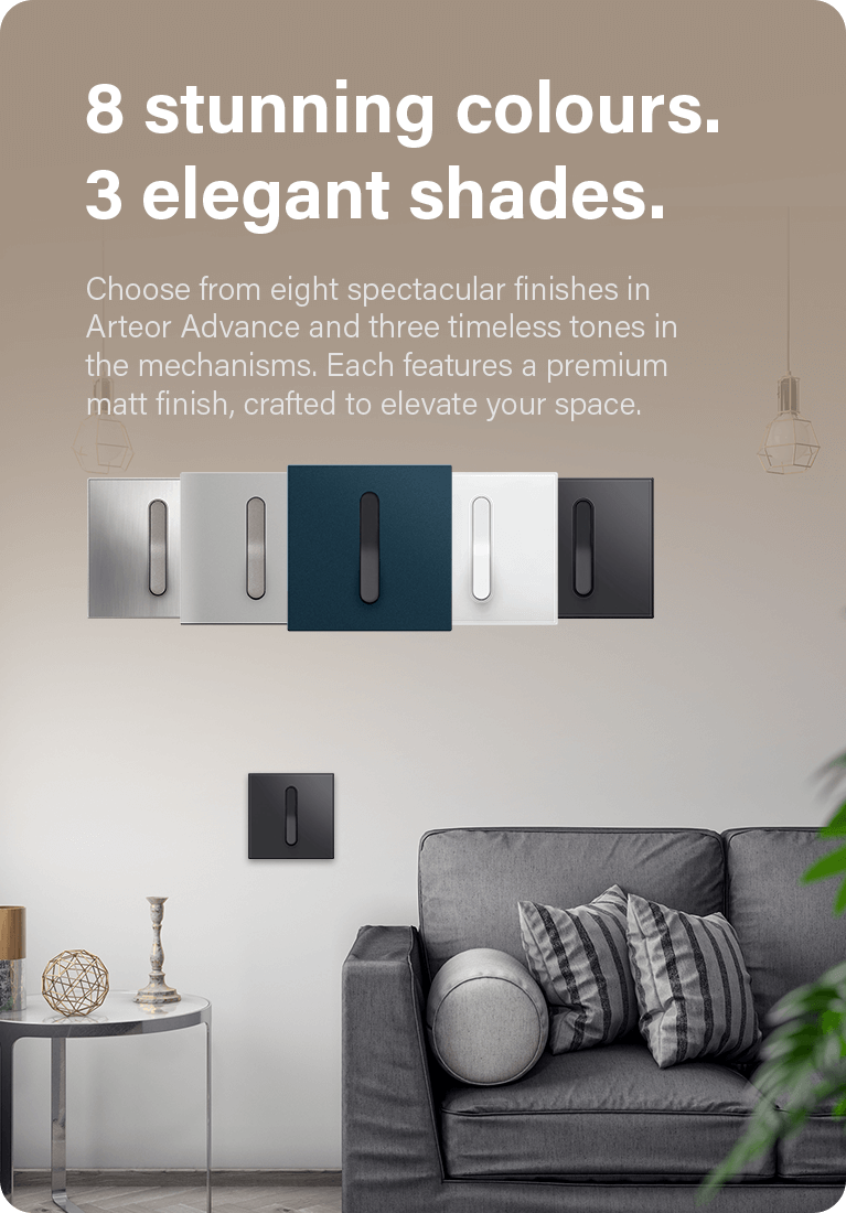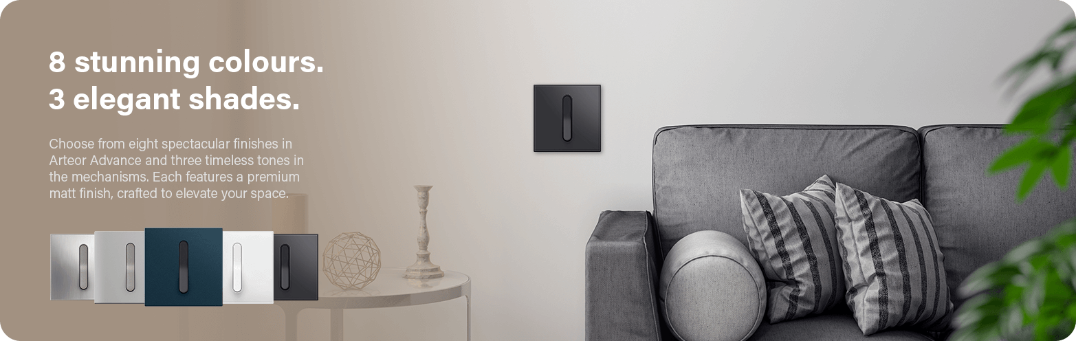 Choose from eight spectacular finishes in Arteor Advance and three timeless tones in the mechanisms. Each features a premium matt finish, crafted to elevate your space.