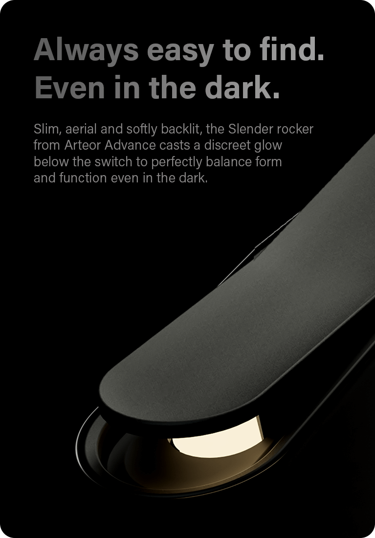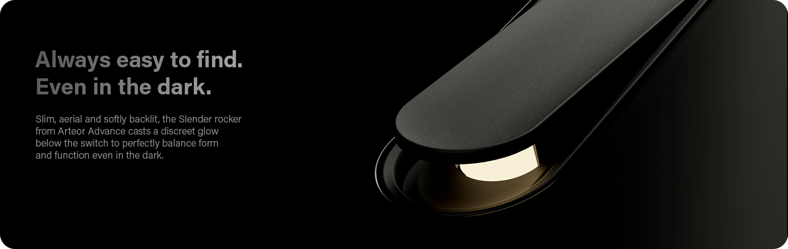 Slim, aerial and softly backlit, the Slender rocker from Arteor Advance casts a discreet glow below the switch to perfectly balance form and function even in the dark.